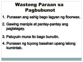 Hugasan pagkatapos gamitin isabit o ilagay sa tamang lagayan ginagamit pangwalis sa magaspang na sahig at sa bakuran. 3 Tingnan ang mga gamit kung may ipapamigay naba. PAGLILINIS NG BAHAY Inihanda ni.