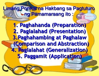 Ito ay tinatawag na LIMANG PORMAL NA HAKBANG SA PAGTUTURO o dili kayay ang HERBARTIAN METHOD LIMANG HAKBANG 1. Pagtuturo ng filipino 1 1. Hakbang na sunud-sunod na isasagawa sa pagsasakatuparan ng layunin o.