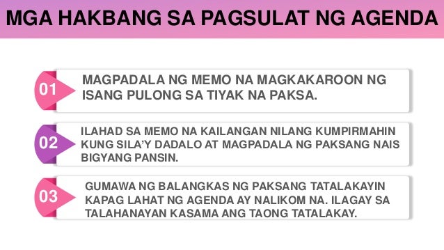 - Karaniwan ang gumagawa nito ay ang responsable sa pagsulat ng agenda tulad ng pangulo ng organisasyon CEO direktor tagapamahala pinuno at iba pa. Unang Hakbang Pumili at maglimita ng paksa Ang paksa ay dapat na alam mo nakawiwili mapagkukunan ng datos may sanggunian may kabuluhan at magagawan ng kongklusyon. Bigyan ng ideya ng mga paksang tatalakayin at sa mga usaping nangangailangan ng atensiyon.