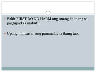 Bakit first do no harm ang unang hakbang sa pagtupad sa mabuti. 2 Malalaman natin ang mabuti kung ito ay bukal sa kalooban ng gumawa at di nag-aantay ng anumang kapalit. Ito ang unang hakbang sa pagtupad sa mabutiIto ay pinaniniwalaan ng may akda dahil ang pananakit sa pananalita man o pisikal ang pinag-uumpisahan ng maraming kaguluhan sa maraming bagay na hindi mabutiSa bawat pagtatalo ay mayroong nagsisimula at layunin ng may akda na maiwasan ang sitwasyong ito bago pa masimulan.