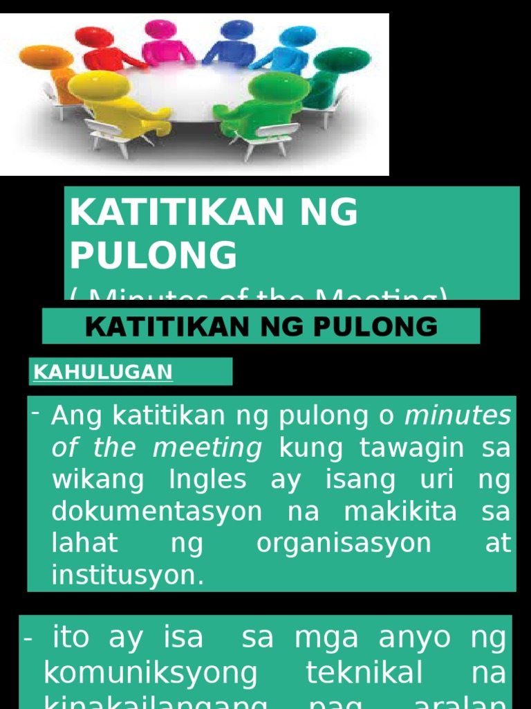 Ang katitikan ng pulong ay ang dokumentong nagtatala ng mahahalagang diskusyon at desisyon. Katitikan ng pangkaraniwang pagpupulong ng yes-o noong ika-17 ng hulyo taong 2017 ganap na ika-1125 ng umaga sa aurora national science high school baler aurora mga dumalo. So para mas ma-gets mo sa wikang Ingles tinatawag itong minutes of meeting.