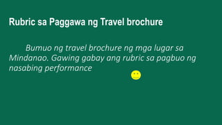 Manunulat na gagawa ng libro tungkol sa kanilang bayan 5. Pamamaraan 41 Panimulang Gawain Pagbabalik-aral tungkol sa pagbuo ng aktuwal na travel brochure. Travel Brochure - Bukod sa mahahalagang detalye tungkol sa mga lugar ay maaaring maglagay ng mga larawan at tips tungkol sa paano pumunta sa lugar mga puwedeng tirahan o gawin doon mga kaugalian o pagdiriwang at iba pang detalye tungkol sa lagay ng panahon sa lugar at perang.
