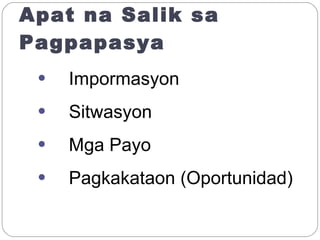 Rivera Mga Hakbang sa Pagpapasya SlideShare uses cookies to improve functionality and performance and to provide you with relevant advertising. Oops Search 1Magkalap ng kaalaman - ang pagiging tama o mali ng isang pagpapasiya ay nakasalalay sa mga katotohanan Think 2. Ibigay ang mga hakbang sa pagbuo ng tamang pagpapasiya sa komunidad Isulat ang iyong sagot sa loob ng piramid.
