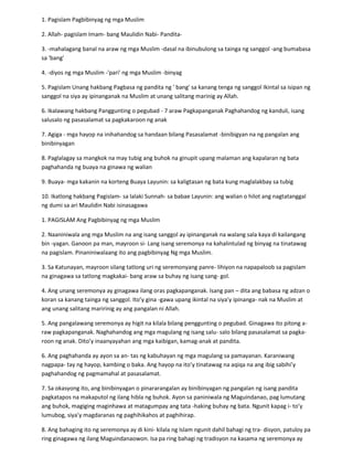 Tatlong hakbang ng pagislamimam o pandita. Iaanyo itongnangunguna ang pangkalahatang layunin na susundan ng 3 o higitpang mga tiyak na layunin. Dito nakalagay ang sanhi o layunin ng paksang inaaralan sa anyong patanong. Sa katunayan mayroon silang tatlong uri ng seremonyang panrelihiyon na napapaloob sa pagislam na ginagawa sa tatlong magkakaibang araw sa buhay ng isang sanggol.