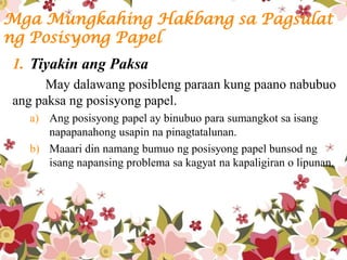 Mga Hakbang sa pagsulat ng posisyong papel Advertisement Answer 48 5 59 kyotakotakoyaki Answer. 1Pumili ng paksang malapit sa iyong puso 15. This video is unavailable.
